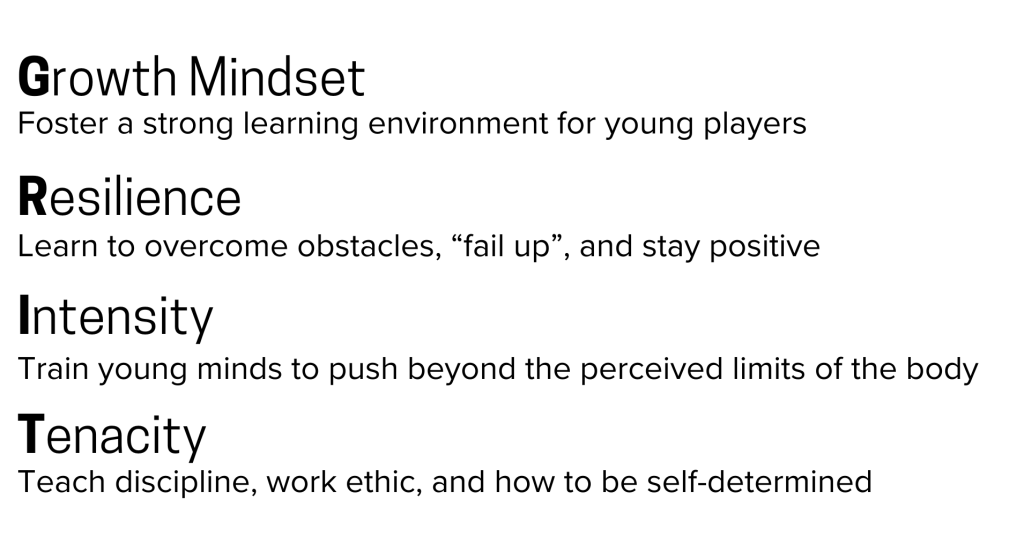 Attitude over Aptitude: early talent does not equate to long-term success, and players with the right attitude often surpass highly talented teammates as the years go by. We teach young players to build year-over-year while playing the right way.